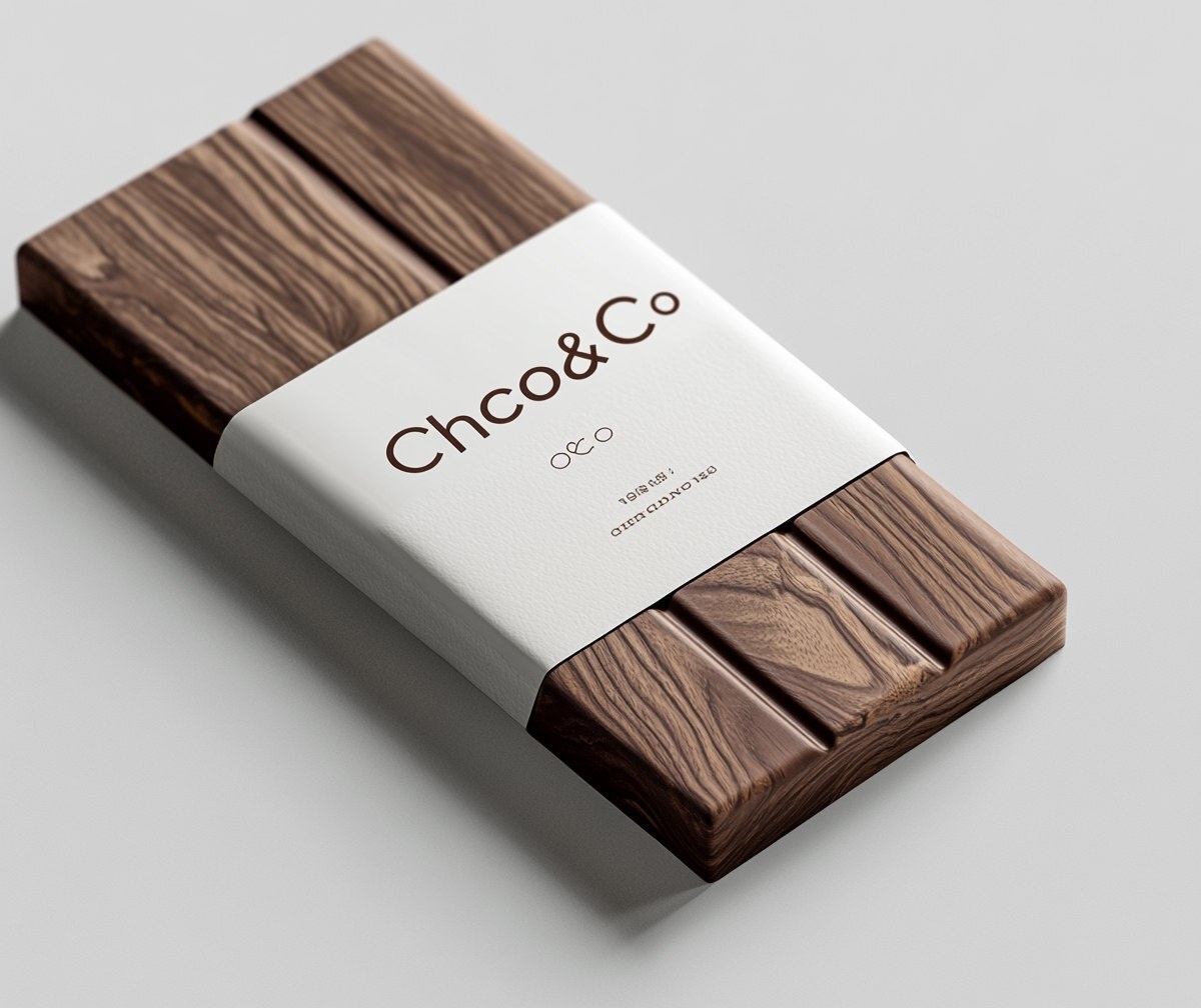 Создано на основе запроса: A minimalist and elegant chocolate bar packaging design for "Choco&Co" featuring a dark wood texture, a white