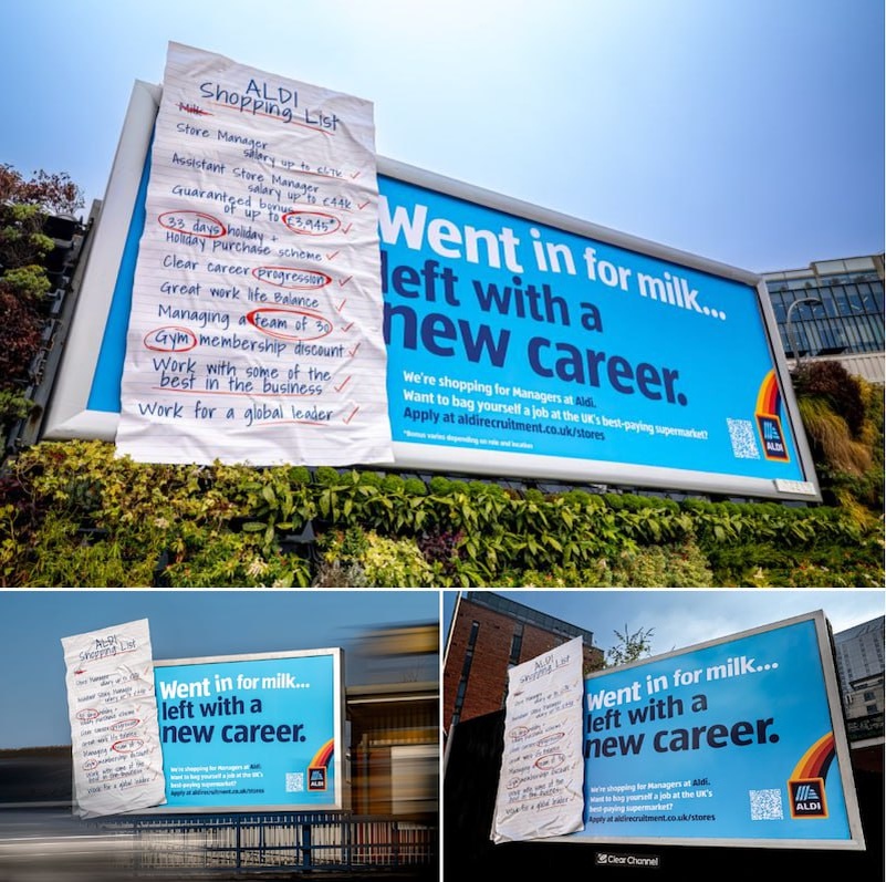 ΡΠ΅ΡΠΈ ΠΌΠ°Π³Π°Π·ΠΈΠ½ΠΎΠ² Aldi ΠΈΠ·ΠΎΠ±ΡΠ°ΠΆΠ΅Π½Ρ Π½Π°ΠΏΠΈΡΠ°Π½Π½ΡΠ΅ ΠΎΡ ΡΡΠΊΠΈ Π³ΠΈΠ³Π°Π½ΡΡΠΊΠΈΠ΅ ΡΠΏΠΈΡΠΊΠΈ ΠΏΠΎΠΊΡΠΏΠΎΠΊ, ΠΏΡΠΈΠΊΡΠ΅ΠΏΠ»Π΅Π½Π½ΡΠ΅ ΠΊ Π±ΠΈΠ»Π±ΠΎΡΠ΄Π°ΠΌ Ρ Π½Π°Π΄ΠΏΠΈΡΡΡ Β«ΠΠ°ΡΠ΅Π» Π·Π° ΠΌΠΎΠ»ΠΎΠΊΠΎΠΌ, Π²ΡΡΠ΅Π» Ρ Π½ΠΎΠ²ΠΎΠΉ ΠΊΠ°ΡΡΠ΅ΡΠΎΠΉΒ».