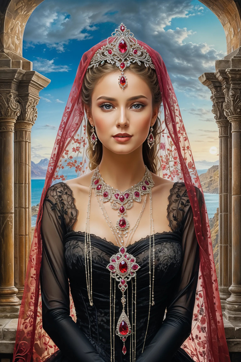 Портрет потрясающе красивой принцессы в полный рост, драматический пейзаж, в стиле романтизма, в изысканной фате, украшения с рубинами, цветами, картина маслом на холсте, в стиле Луиса Ройо, Пино Даени, Жозефины Уолл, детальное лицо черты лица, пронзительный взгляд, нежные краски для стеклянной поверхности, мелкие детали, отмеченный наградами фотореализм, динамичность, органичность, разнообразие освещения... двойная экспозиция, потрясающее, изысканное, детализированное лицо, неотразимое, величественное, привлекающее внимание, великолепное, очень стильная, красивая, восхитительная, завораживающая, очень привлекательная, идеальное лицо, сочный, сияющий образ, сияние, шедевр в портретном стиле. Изображение 8k, созданное в стиле импрессионизма под влиянием работ Карне Гриффитса, Расса Миллса, Марка Демстедера, Андреаса Ли, Вадима Кашина, Дега, Моне, отличается точностью и красотой пейзажа, симметричной композицией в центре, трехмерное освещение, лучи, яркая четкость цветовых отражений, луч