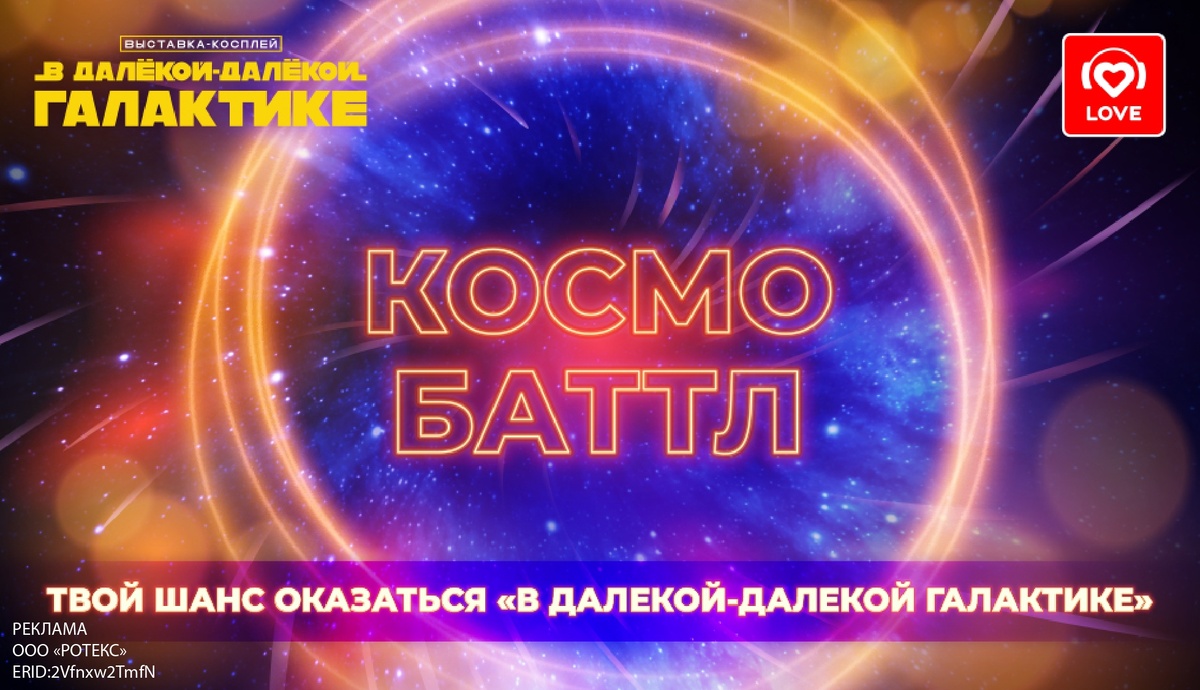 В преддверии Дня космонавтики команда Love Radio решила отправить своих слушателей в невероятное путешествие! Именно поэтому мы запустили акцию под названием «КосмоБаттл», победители которой смогут попасть на выставку-косплей «В далекой-далекой Галактике». Она проходит на ВДНХ в павильоне №21. Чтобы стать участником, внимательно слушай Love Radio по будням с 1 по 11 апреля. Когда прозвучит специальный сигнал, дозванивайся в студию по номеру 8 495 956 106 и 6. Твоя задача назвать трек, который мы загадали. Если удача будет на твоей стороне, то ты отправишься покорять новые галактики! Уверены, успех ждет тебя! Правила акции Реклама. ООО «Ротекс»