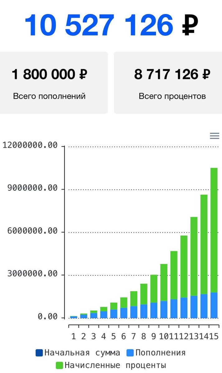 Вы видите 2 картинки - это разница между 12 и 15 годами инвестирования по 10000₽ в месяц. Всего 10000₽ в месяц. С начальным капиталом 10000₽. За 3 «не упущенных» года вложено было 360000₽, а разница в финальном капитале составила почти 5 млн!