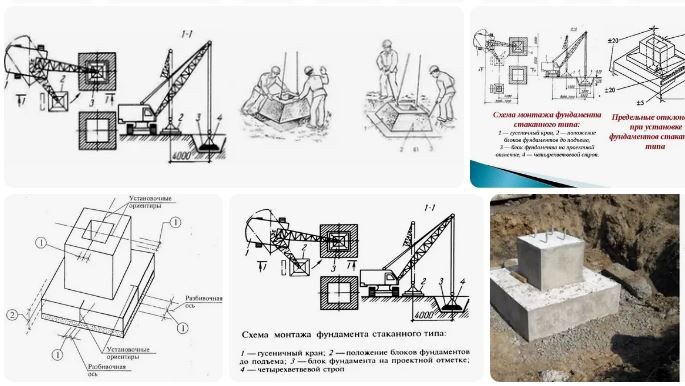 Монтаж фундамента стаканного типа происходит следующим образом. Перед установкой фундамент производят подготовительные работы. Для начала выносят на обноску оси фундаментов. Далее проверяют горизонтальность основания. Основание для фундамента состоит из гравия или щебня, которые втрамбовывают в почву. Размеры основания при этом должны на 300 миллиметров превышать размеры фундамента по длине и ширине.