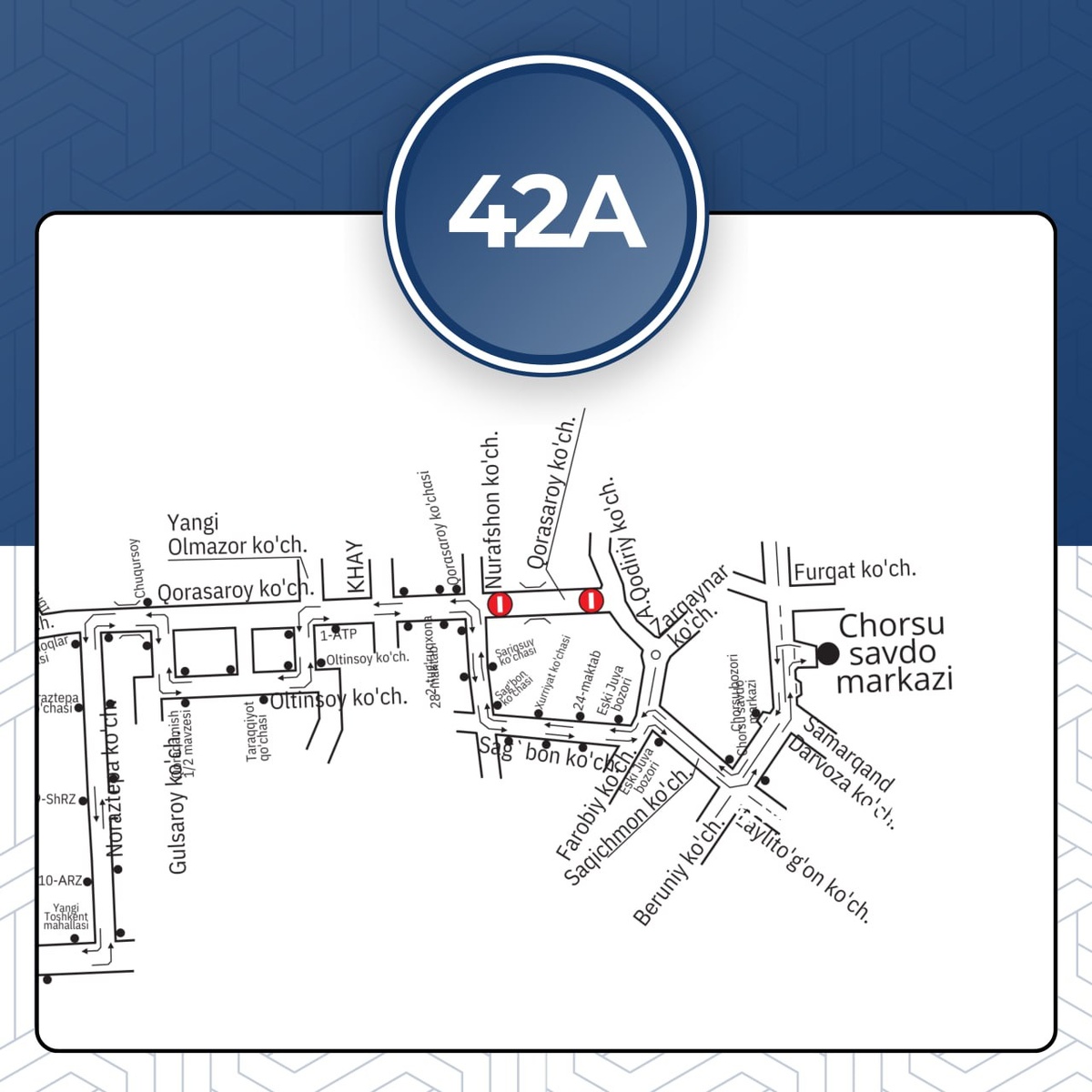 🚍 Olmazor tumanidagi Qorasaroy ko‘chasining bir qismi yopilayotgani sababli ba’zi avtobus yo‘nalishlarida vaqtinchalik o‘zgarishlar