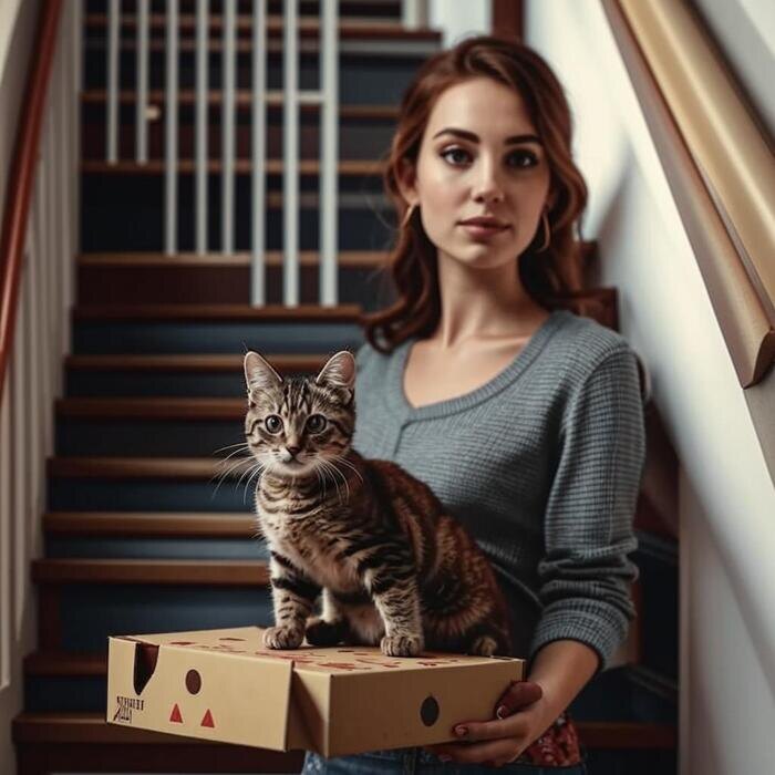 - Да вот, - разводит девушка руками, – пиццу мне привезли. А эта дурочка, – показывает она на кошку, – выскочила и ломанулась вниз; я за ней побежала. Ну и естественно, - смеется она, - что ключи я забыла, а вот поднять ручку вверх и закрыть дверь не забыла.