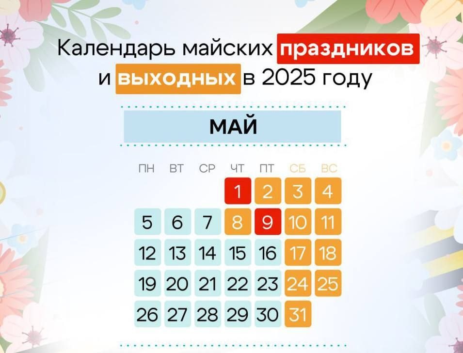 Россиян ждут целых восемь выходных в майские праздники В мае страна будет отдыхать дважды: с 1 по 4 мая и с 8 по 11 мая. Однако между этими двумя периодами предстоит поработать. В этом году количество праздничных дней увеличилось за счёт переноса выходных с 23 февраля и 8 марта.