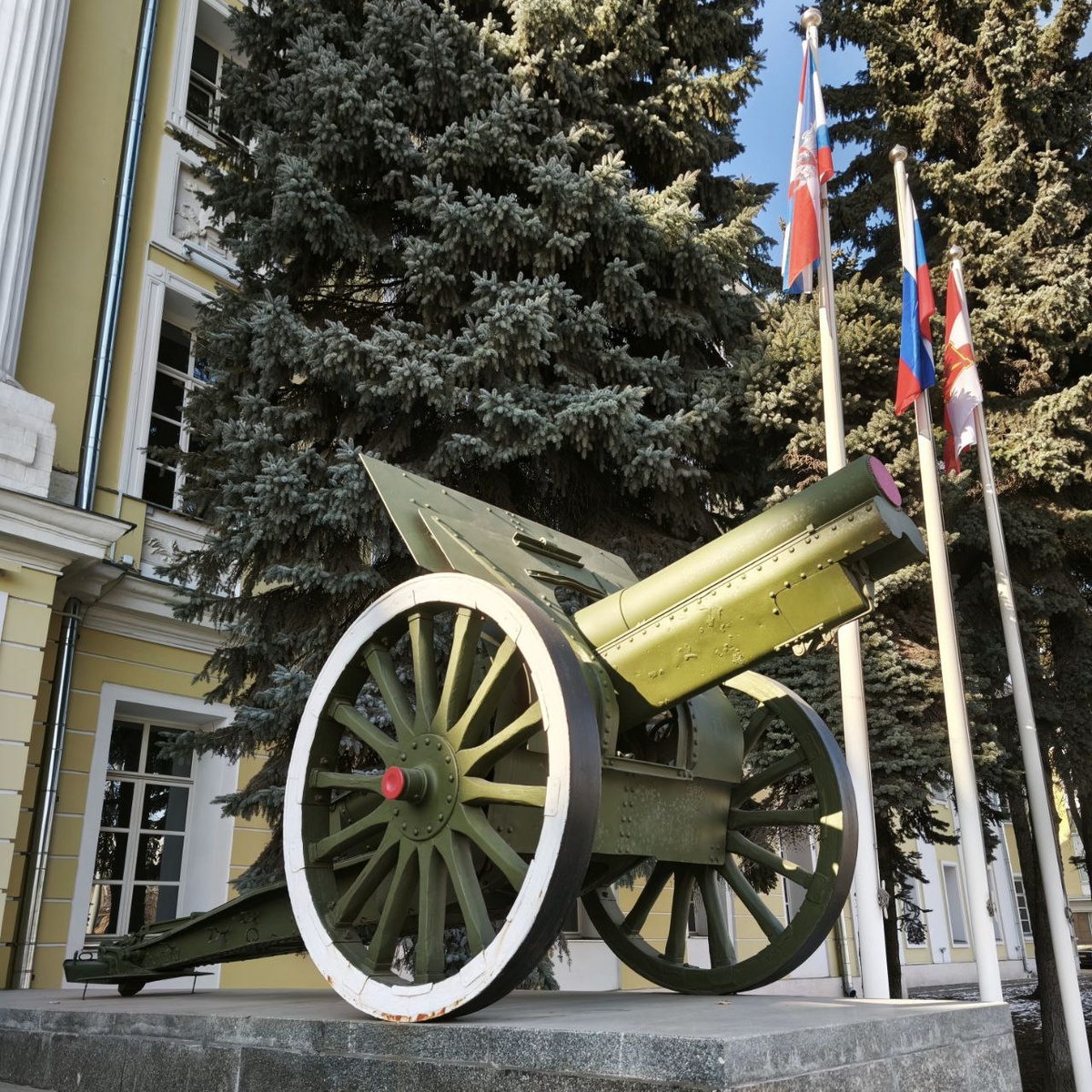 Одно из самых любопытных и оригинальных украшений Космодамианской набережной это две подлинные 122 мм гаубицы Шнейдера 1910/1930 г.г. оформляющие лестницу парадного входа Кригскомиссариата, ныне штаба Московского военного округа. Тут необходимо пояснить, что попав в армию я имел дело с относительно современной 122 мм гаубицей Д30, модификации которой используются до сих пор. Термин «гаубица» используется для мощных орудий стреляющих с помощью специального прицела навесом через препятствия загораживающие прямую видимость цели, «пушка» приспособлена стрелять только прямой наводкой.