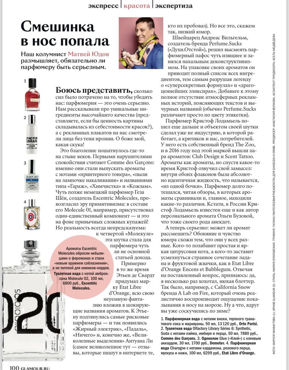 «Боюсь представить, сколько сил было потрачено на то, чтобы убедить нас: парфюмерия — это очень серьезно. Нам рассказывали про уникальные ингредиенты высочайшего качества (представляете, если бы ценность картины складывалась из себестоимости красок?), а с рекламных плакатов на нас смотрели лица без тени иронии. О боже мой, какая скука! Это благолепие пошатнулось где-то на стыке веков. Первыми нарушителями спокойствия считают Comme des Garçons: именно они стали выпускать ароматы с нотами «принтерного тонера», «пыли на лампочке накаливания» и названиями типа «Гараж», «Химчистка» и «Кожзам». Чуть позже немецкий парфюмер Геза Шён, создатель Escentric Molecules, провозгласил эру примитивизма: в составе его Molecule 01, например, присутствовал один-единственный компонент — и это на фоне привычных сложных купажей! Но реальность всегда непредсказуема: к четвертой «Молекуле» эта шутка стала для парфюмера чуть ли не основной статьей дохода. Примерно в то же время Этьен де Свардт придумал марку Etat Libre d’Orange, всю свою неуемную фантазию вложив в шокирующие названия ароматов. К Этьену подтянулись самые рисковые парфюмеры — и так появились «Жирный электрик», «Падаль», «Ничего» и, конечно же, «Великолепные выделения» Антуана Ли (самое великолепное тут — отзывы, которые пишут в интернете те, кто их пробовал). Но все это, скажем так, низкий юмор. Швейцарец Андреас Вильгельм, создатель бренда Perfume.Sucks («Духи.Отстой»), решил высмеять парфюмерный пафос чуть изящнее и занялся нахальным деконструктивизмом. На упаковке своих ароматов он приводит полный список всех ингредиентов, тем самым разрушая легенду о «суперсекретных формулах» и «драгоценнейших эликсирах». Добавьте к этому полное отсутствие атмосферных рекламных историй, поясняющих текстов и высурнух названий (обычно Perfume.Sucks различают просто по цвету этикетки). Парфюмер Кристоф Лодамьель пошел еще дальше и объектом своей шутки сделал уже не индустрию, в которой работает, а критиков и нас, потребителей. У него есть собственный бренд The Zoo, и в 2016 году под этой маркой вышли пара ароматов: Club Design и Scent Tattoo. Ароматы как ароматы, но спустя какое-то время Кристоф озвучил свой замысел: внутри обоих флаконов была абсолютно идентичная жидкость, что называется, «из одной бочки». Парфюмер долго потешался, читая обзоры, в которых ароматы сравнивали и, главное, находили какие-то различия. Кстати, в России Кристоф Лодамьель известен еще и как автор персонального аромата Ольги Бузовой, что тоже своего рода анекдот. А теперь серьезно: может ли аромат рассмешить? Обоняние и чувство юмора схожи тем, что они у всех разные. Кого-то позабавит простая и яркая цитрусовая нота, а кого-то заставит усмехнуться странное сочетание ладана и фруктовой жвачки, как в Etat Libre d’Orange Encens et Bubblegum. Отвечая на поставленный вопрос, признаюсь: да, я несколько раз хохотал, нюхая блоттер. Так было, например, с California Snow бренда A Lab on Fire, который очень реалистично воспроизводит ощущение покалывания в носу на морозе. Ну а что, вдруг вы уже соскучились по зиме?»