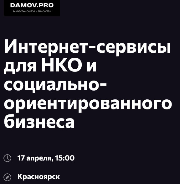17 апреля, 15:00 г. Красноярск, пр. Красноярский рабочий, 160е, Развлекательный центр «4 комнаты». Приглашаем вас на мероприятие, посвященное современным цифровым продуктам для поддержки социально-ориентированного бизнеса и НКО. Узнайте, как создать сайт и внедрить CRM для вашей организации, а также познакомьтесь с реальными кейсами и инструментами продвижения проектов.