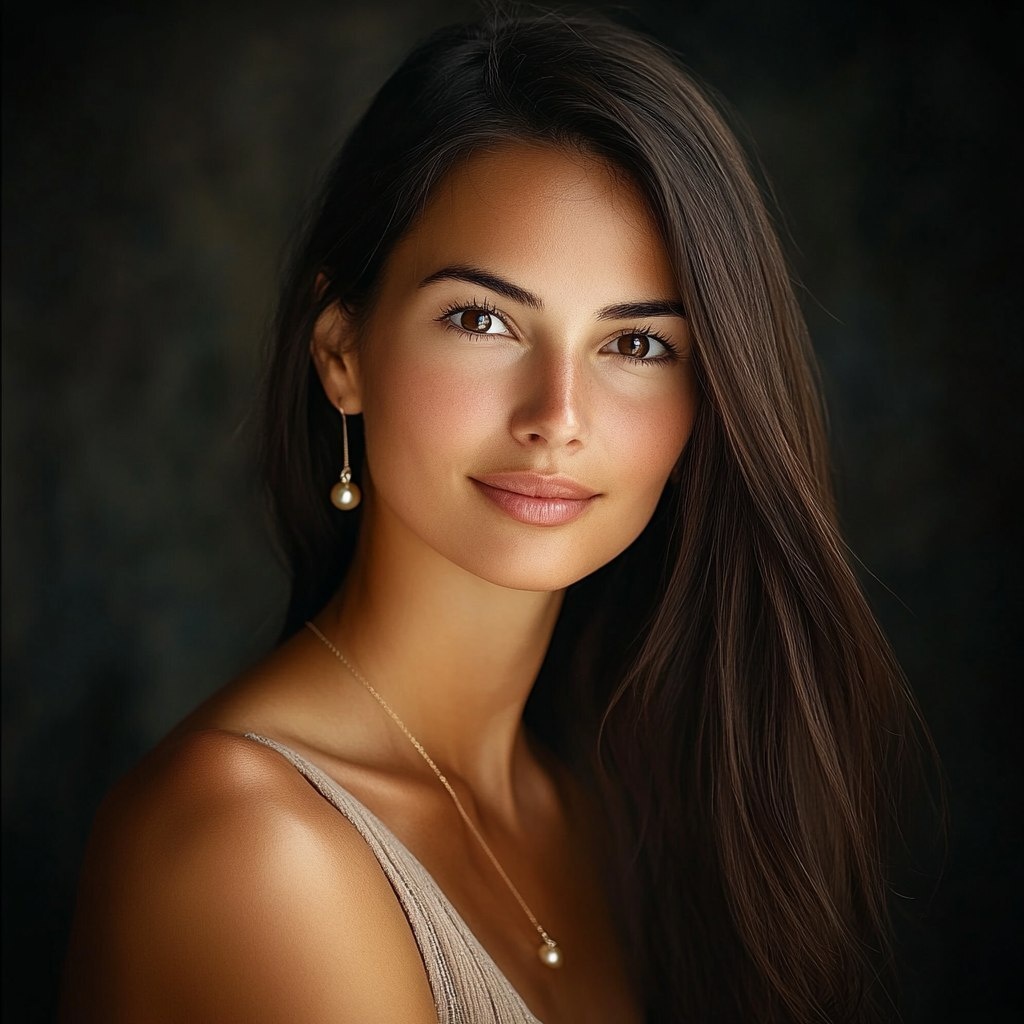 Создано на основе запроса: A portrait of a beautiful woman with long dark brown hair and deep brown eyes, looking directly into the camera