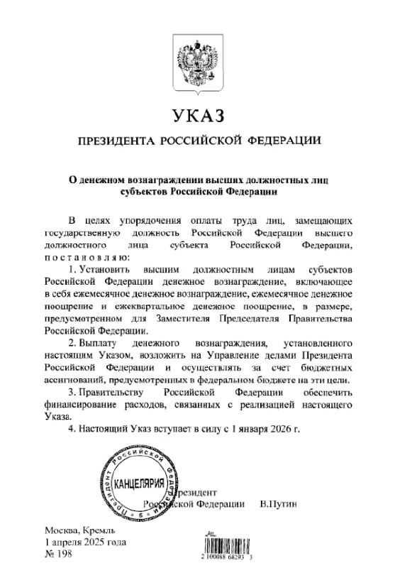 Российским губернаторам поднимут зарплаты. С 2026 года они начнут получать столько же, сколько вице-премьеры правительства. Такой указ подписал Путин.