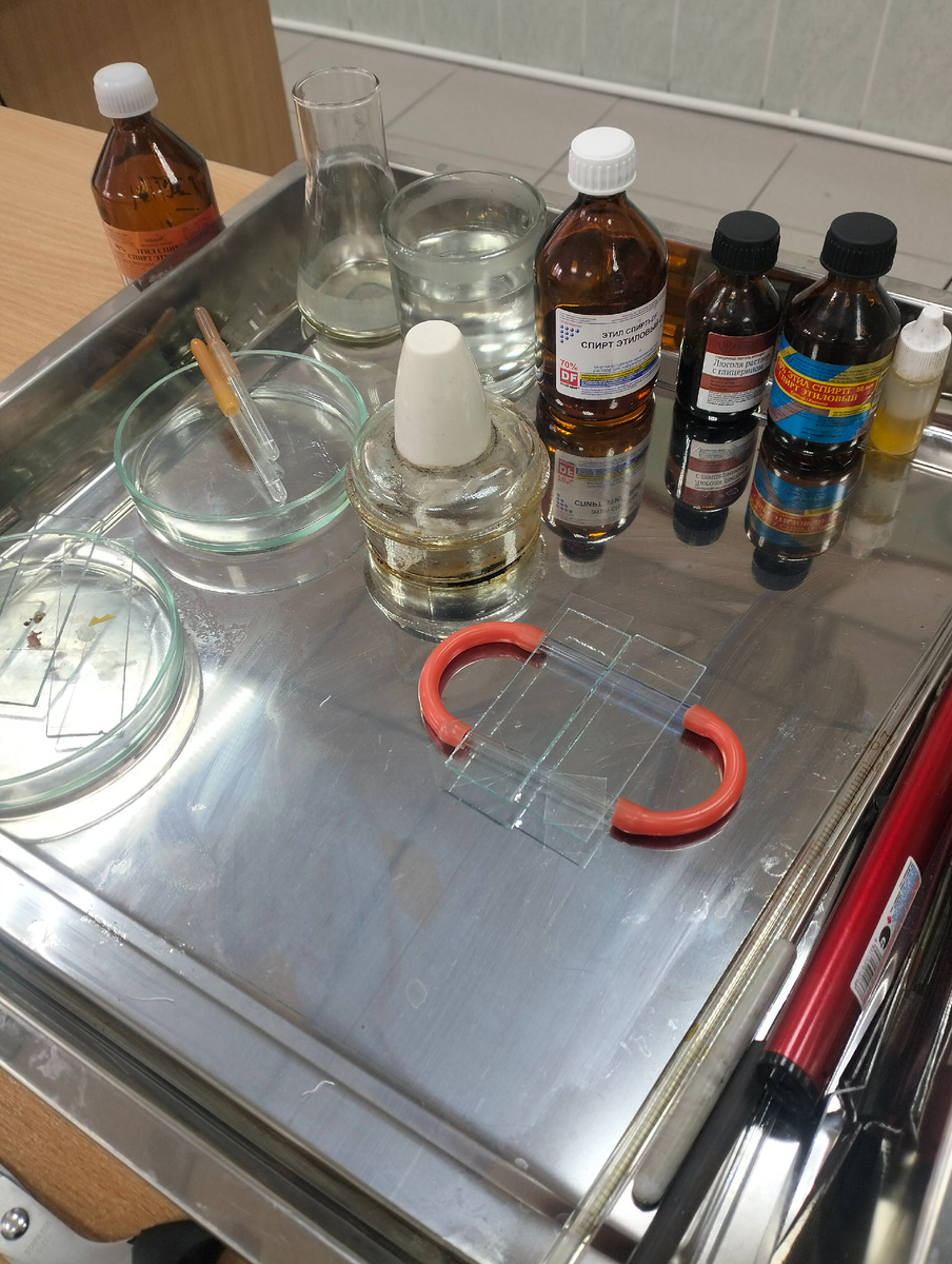 Цель данного исследования — изучить строение плесневых грибов, образующихся на поверхности апельсина, с помощью микроскопа. В ходе работы предполагается рассмотреть их морфологические структуры, определить основные характеристики и особенности развития, а также зафиксировать полученные наблюдения. Оборудование и материалы: Прежде чем приступить к основным этапам работы, я позаботился о стерильности. Рабочую поверхность обработал спиртом, протер её бинтом, чтобы минимизировать риск загрязнения. Затем я взял иглу и стерилизовал её с помощью горелки, обеспечивая чистоту инструмента перед взаимодействием с образцом. Затем настал момент самого главного – я аккуратно взял образец плесени с поверхности апельсина. Её пушистая текстура и зеленовато-серый оттенок сразу подсказали мне, что передо мной может быть представитель рода Penicillium. Осторожно разместив образец на предметном стекле, я добавил каплю воды и накрыл покровным стеклом, подготовив препарат для микроскопического анализа. П
