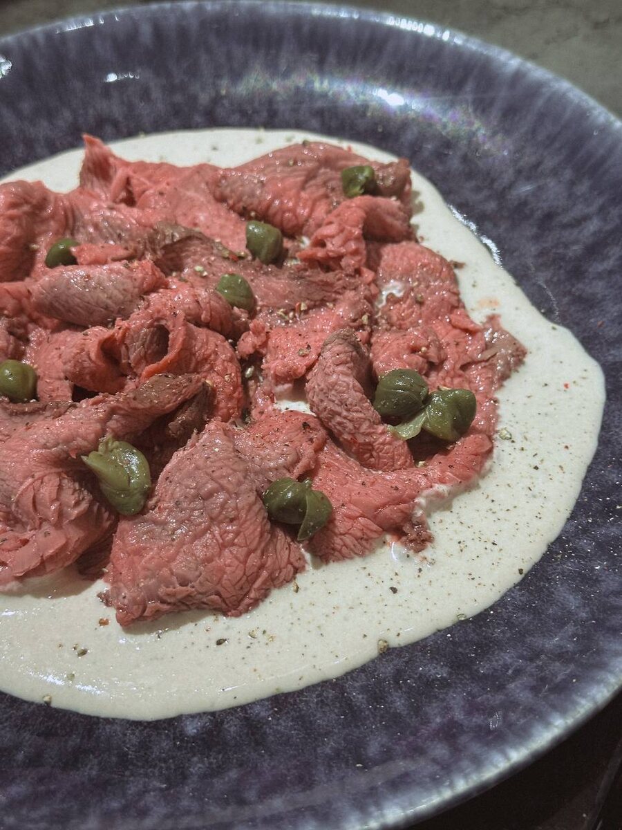 Вителло тоннато на ужин? Легко🔥 Как прекрасно, что кроме меня это никто дома не ест, не нужно делиться 😁 Или история о том, насколько крутой ростбиф получается в сувид, это просто отвал всего, не оторваться🤤 Для быстрого соуса: 80гр тунца (беру в ленте упаковки по 3 маленьких баночки) Столовая ложка майонеза 4-5 каперсов ( + для украшения) Все пробить блендером до однородности #рецепт