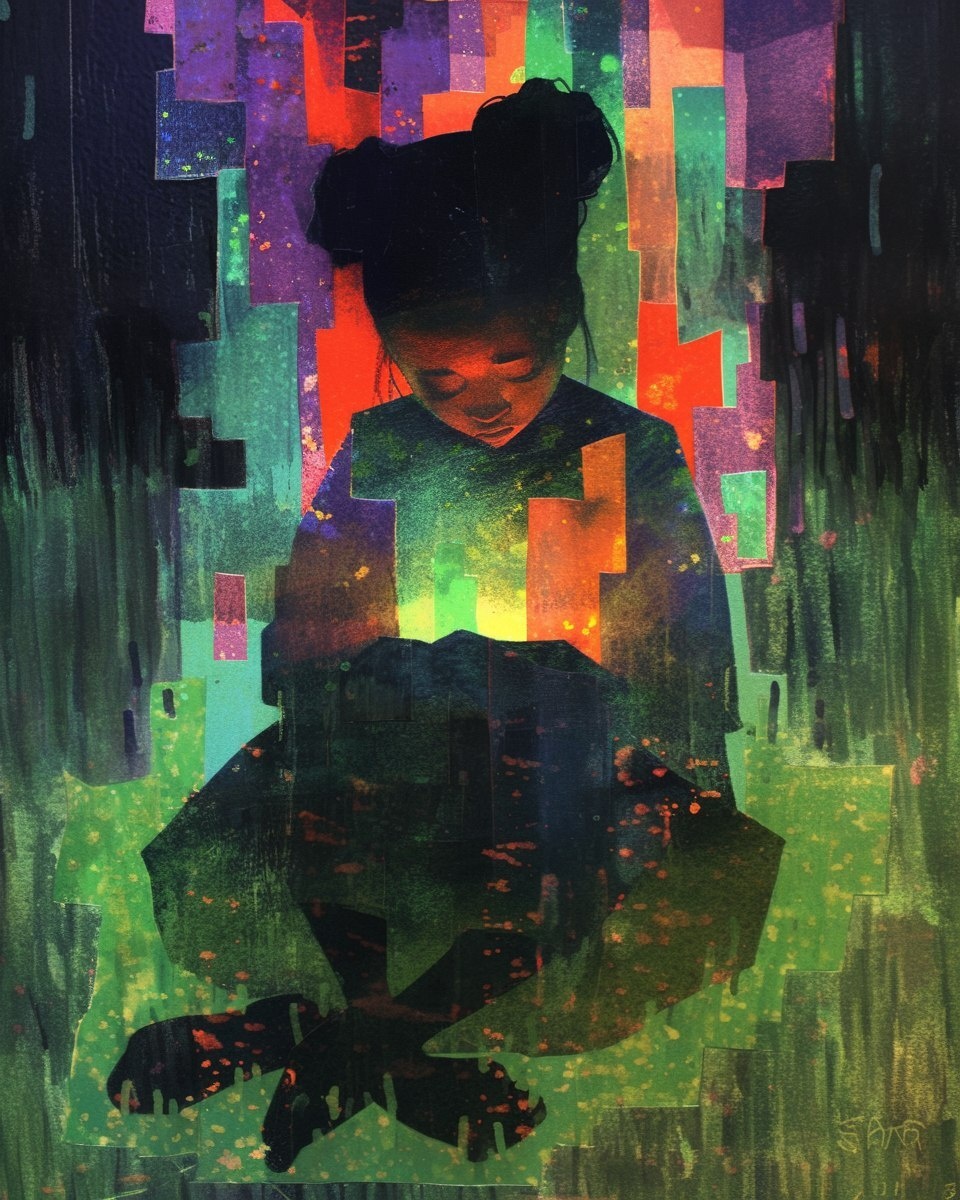 Создано на основе запроса: hypnagogic maximalism physicsbased paper collage, in the style of suburban flat shading, simplified figures