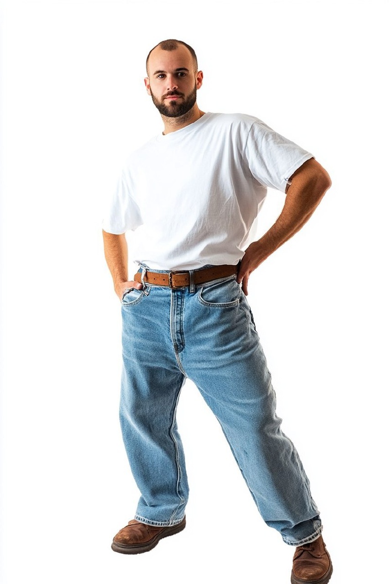Создано на основе запроса: man wearing baggy white tshirt and blue jeans with brown belt, standing in wide legged stance, no background, real photography