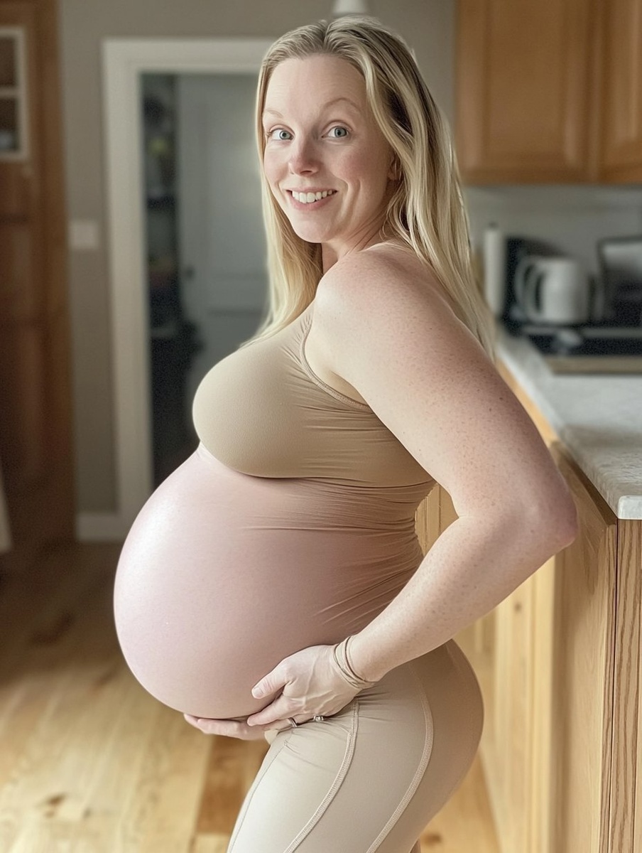 Автоперевод: Гигантская, очень беременная, красивая блондинка снимает видео о себе в Instagram с земли, стоит рядом с кухонным стойкой и держа ее живот на поздней стадии беременности с мягким выражением и легкой улыбкой.