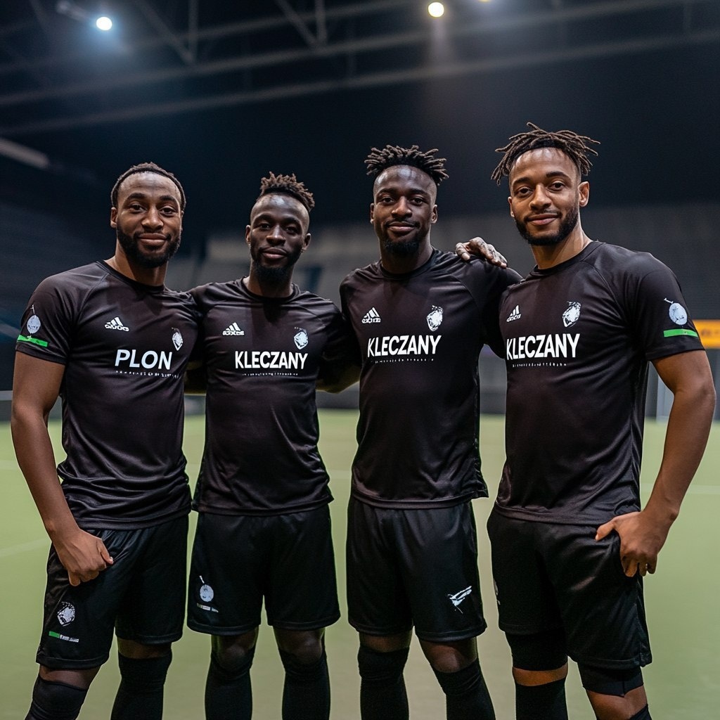 Создано на основе запроса: presentation of five black football players of the Plon Klęczany team, the inscription on the T-shirts is "PLON KLECZANY"