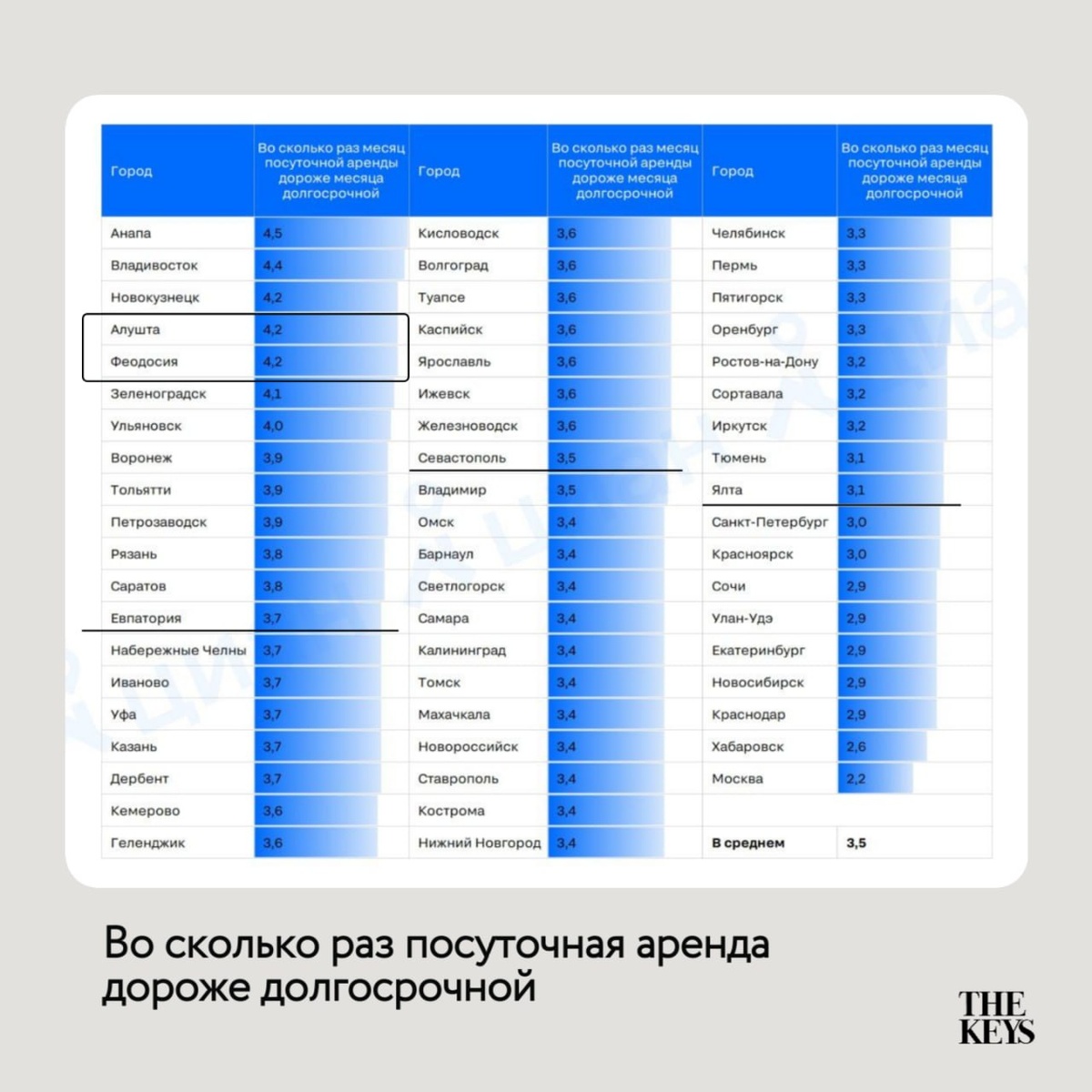 В этих крымских городах посуточная аренда в 4,2 раза дороже долгосрочной Интересная аналитика по рынку аренды👇🏻 Если в среднем сдача квартиры посуточно может принести в 3,5 раза больше денег, максимальное соотношение будет в курортных городах. В Крыму это Алушта и Феодосия – здесь сдавать недвижимость в посуточную аренду выгоднее в 4,2 раза, чем в долгосрочную. Дальше покажем ещё один фактор, который играет важную роль для Алушты – по плотности туристического потока. Важно правильно оценить этот показатель, если рассматриваете стратегию покупки квартиры или апартаментов у моря под сдачу в аренду 💰