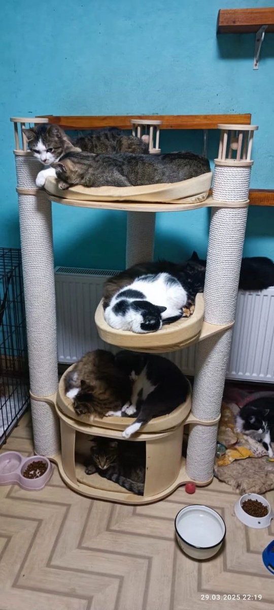 Друзья, на днях собран второй комплекс, поменьше💖 Я ранее писала, что было заказано 2 комплекса из березы, тк старые все пришли в негодность... Как видите, котики их сразу облюбовали и улеглись по двое, в тесноте да не в обиде 🥰 Сбора на них не было, деньги взяли из общих поступлений...