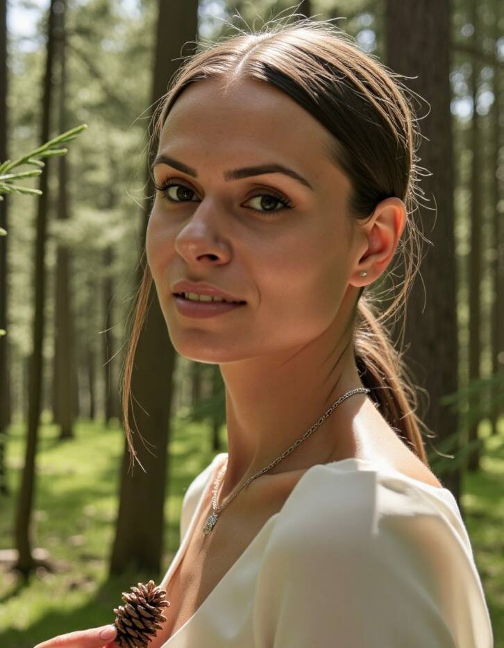 A soft and intimate portrait photoshoot set in a sun-dappled pine forest on a warm summer day. The model stands gracefully among tall evergreens, bathed in delicate natural light that filters through the trees. The atmosphere is serene and poetic, evoking a sense of peace, solitude, and connection with nature. The focus is on natural beauty, calm expression, and the enchanting contrast between soft skin and deep forest greens.