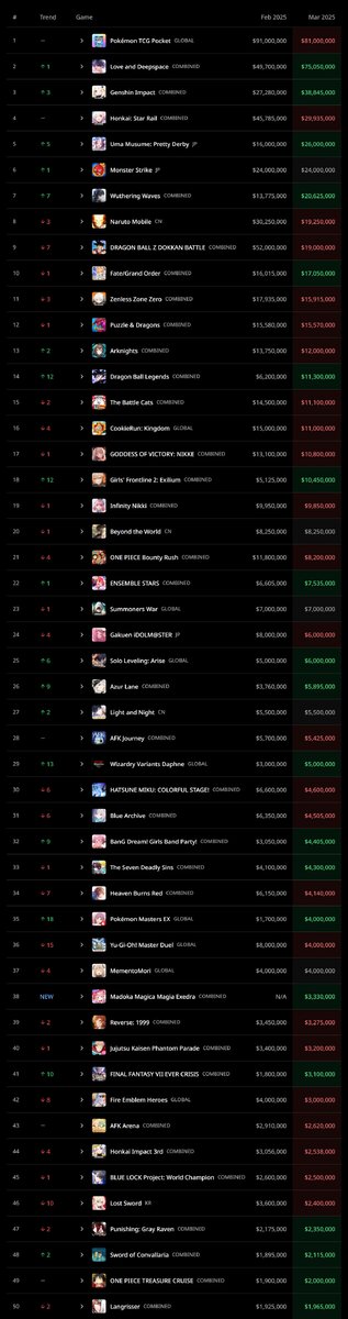 А вот и статистика самых прибыльных гача-игр за прошедший месяц подоспела. Что можно интересного сказать? Лидерство сохранили “Покемоны” — Pokemon TCG Pocket. Хоть игра и просела по сравнению с прошлым месяцем, падения на 10 миллионов долларов оказалось недостаточно, чтобы уступить первое место. На второй строчке остались сладкие азиатские мальчики из Love and Deepspace, а на третью вернулась великая и могучая Genshin Impact. Honkai: Star Rail осталась на четвертой позиции, а на пятую прискакали девочки-лошадки из Uma Musume: Pretty Derby. С остальным рейтингом вы можете ознакомиться на картинке ниже.
