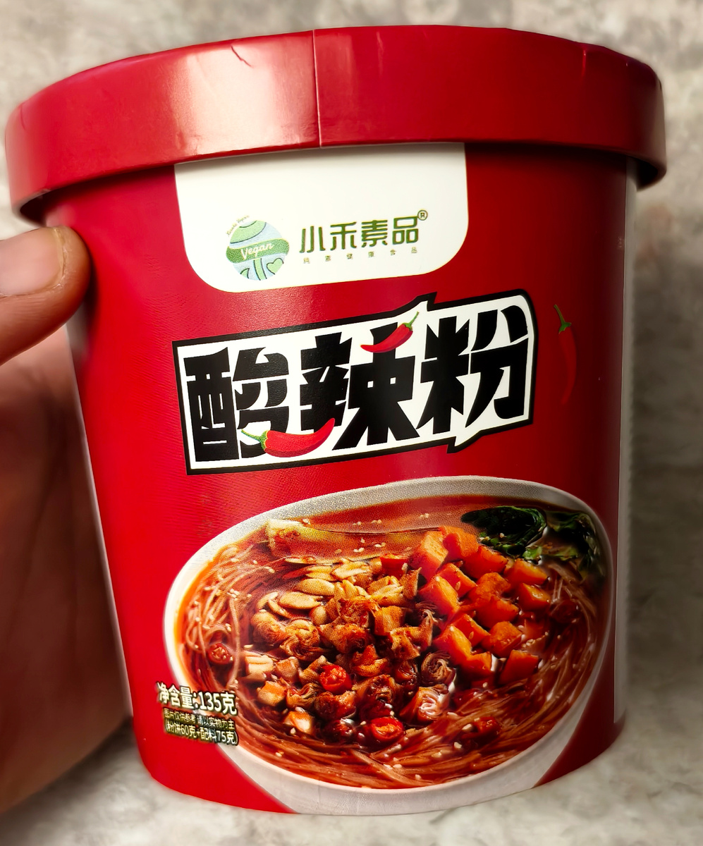 Всем привет! Сегодня буду пробовать веганский вариант китайской лапши. Заказал за 200 рублей на маркетплейсе. На картинке все выглядит очень аппетитно. А вот красные перчики предвещают беду. Есть наклеечка, что лапша вегетарианская, значит бульон будет овощной. Итак, лапша изготовлена в Китае. Импортер: ООО "СМ ТИМ", г. Москва. В качестве лапши здесь фунчоза из сладкого картофеля. Соус на основе подсолнечного и кунжутного масел, чили перца и соевого соуса. В приправе также присутствует чили перец. Ещё есть уксус сделанный на горохе, ячмене, пшеничных отрубях и сорго. Из овощей присутствует соя, морковь, фасоль. И арахис, приправленный специями. Также не обошлось без глутаматика. Я таким бумажкам особо не доверяю. Там часто пишут не все ингредиенты или наоборот добавляют что-нибудь лишнее. Внутри маленький свёрток с фунчозой. Мне кажется я меньше ещё не встречал. И я не понял в каком месте она широкая, как указано на упаковке? А вот пакетиков с добавками много. Соус, арахис, укс