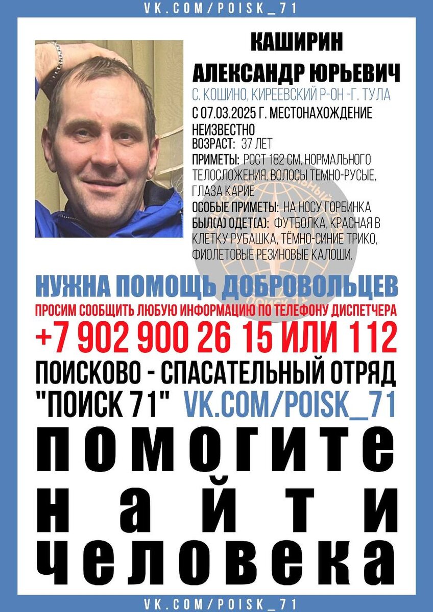 Внимание!!! Помогите найти человека!!! Может находиться в вашем городе, районе!!! Пропал:КАШИРИН АЛЕКСАНДР ЮРЬЕВИЧ, 37 лет Проживает:с.Кошино, Киреевский р-он. -г.Тула Приметы : рост 182 см, нормального телосложения, волосы темно-русые, глаза карие. Нос с горбинкой. Одет: футболка, красная в клетку рубашка, тёмно-синие трико, фиолетовые резиновые калоши. Просьба всем,кому что-либо известно сообщить по номеру телефона диспетчера 8(902) 900-26-15 или 112.