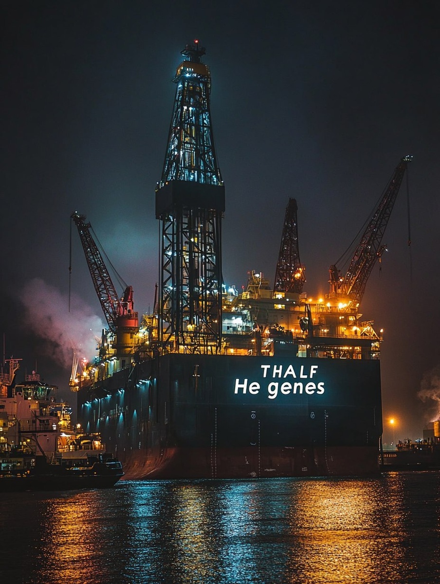Создано на основе запроса: photo of massive oil rig with the words "THALF He genes" written on it, in port at night illuminated by bright lights, big ship nearby