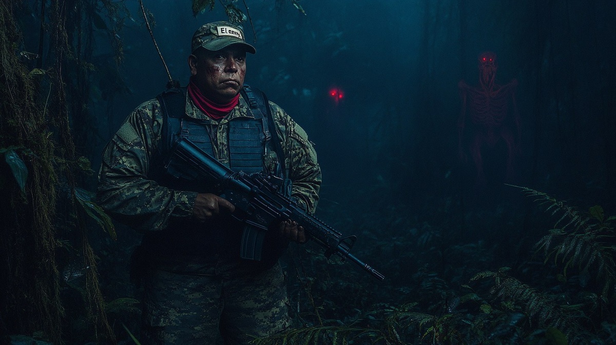 Создано на основе запроса: A haunted Colombian jungle at night, thick with fog and shadows. In the center, a weathered and tense Colombian veteran soldier named Andrés "El Fénix" Ramírez stands with a rifle, wearing a worn jungle camouflage uniform and a red bandana, his face marked by scars and fear. Behind him, an old, crumbling military base covered in moss and vines looms, partially hidden by the darkness. Strange symbols glow faintly on the walls. From the edge of the jungle, ghostly red eyes peer out, and a faint humanoid shadow with elongated limbs and a distorted face emerges from the mist. The atmosphere is oppressive, filled with silence and the sensation of being watched. The moonlight barely pierces the dense canopy, and the air is thick with tension and ancient evil. --- Автоперевод: Колумбийские джунгли с привидениями ночью, густые с туманом и тени. Круто вышло? 🤔 https://dzen.ru/id/65c0c65c86e4f837c27b24d7 #ИИ #AI #нейросеть #midjourney #art