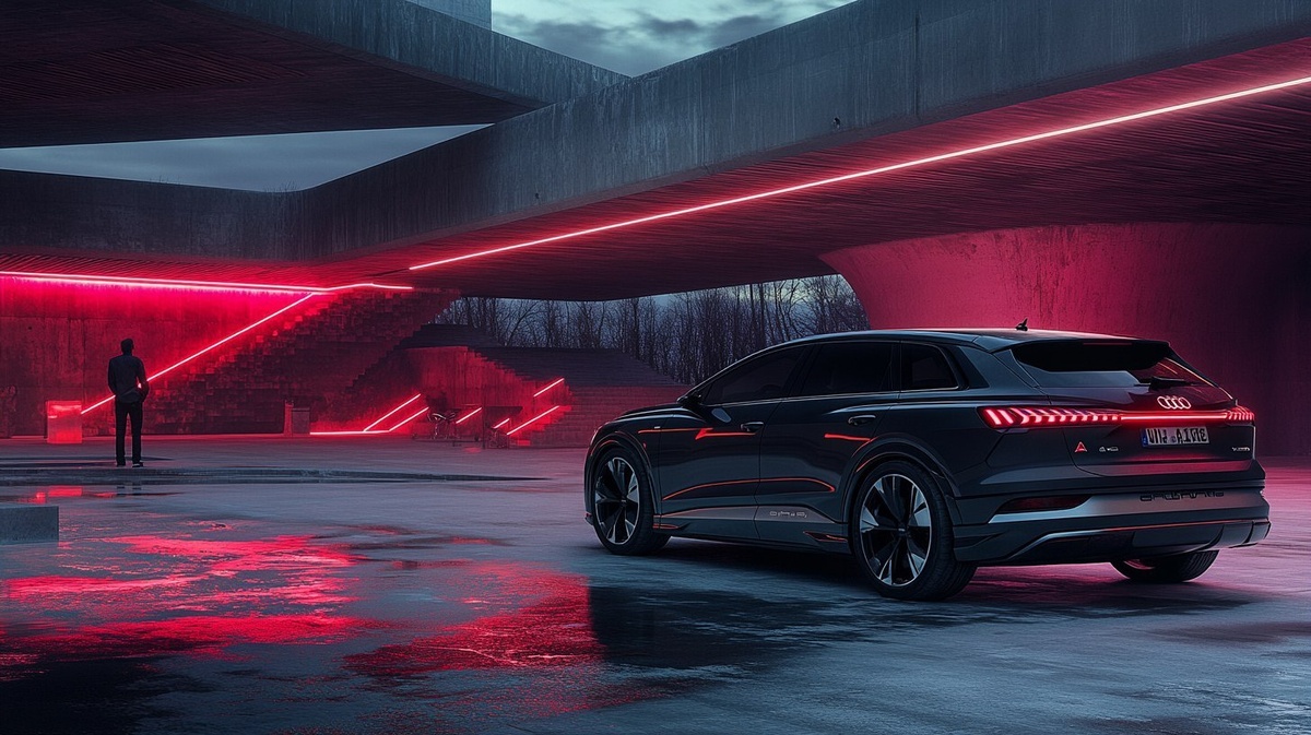 Автоперевод: Дрон с выстрелом черной Audi A 6 E-Tron Avant ночью перед минималистичной архитектурой абстрактной формы, красных и белых светодиодных светодиодных светильников на бурении, без архитектуры, Audi A6 E-Tron Avant парковка в пустоте, как и яркие светодиодные огни, освещающие ночную среду, человек наблюдает за автомобилем, сверхвысокие детали, гиперреалисты, гиперреалисты, гиперреалистичные