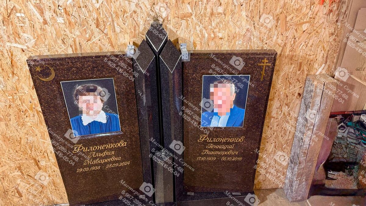 Между ними — акцентный центральный элемент из чёрного гранита Габбро Диабаз, соединяющий композицию в единое целое. Портреты — керамогранит, обожжённые в печи при экстремально высоких температурах, с изысканным полированным фацетом.