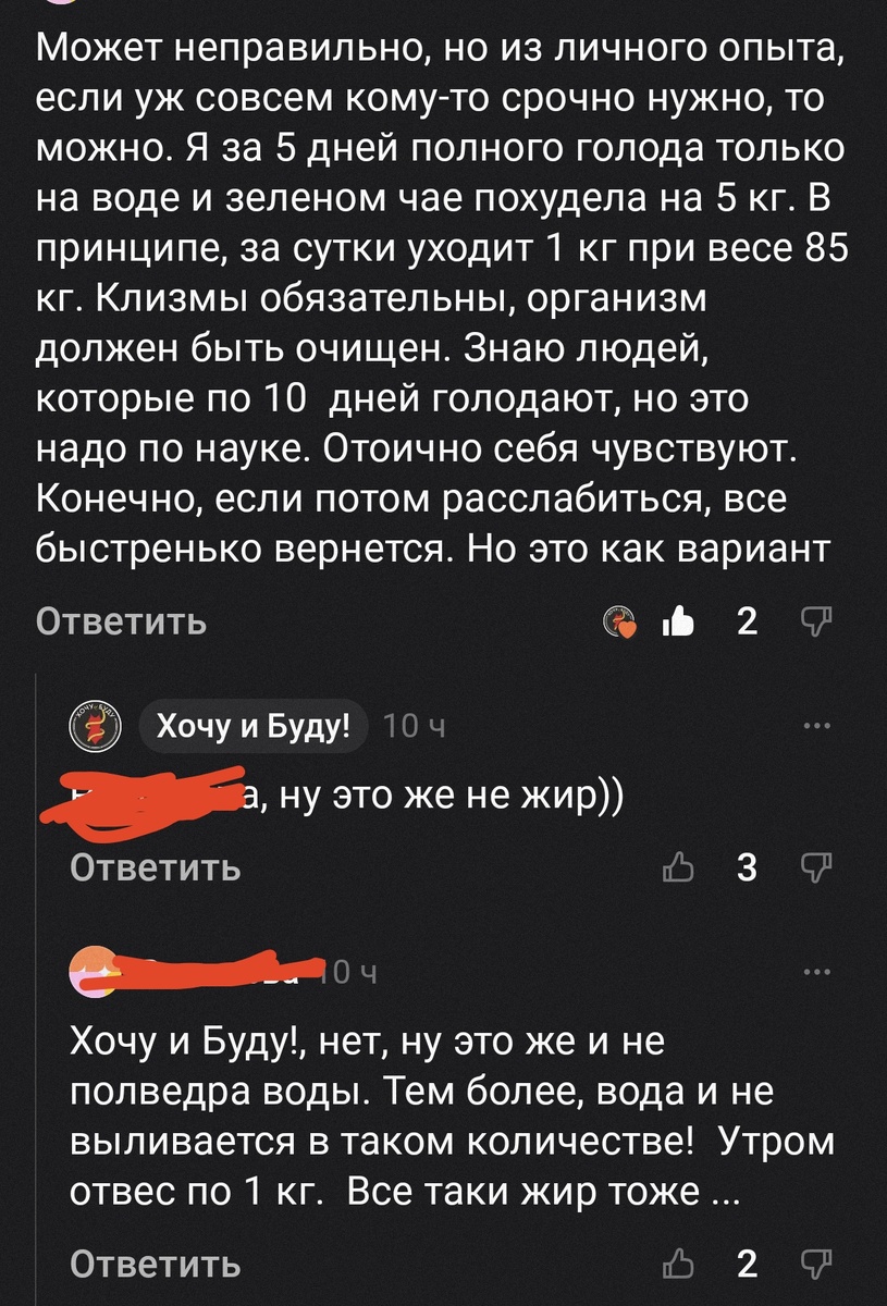 Друзья, приветствую! Под моей недавней шуточной статьей, приуроченной к 1 апреля с "вредными советами" о том, как не надо худеть, у меня состоялась интересная дискуссия. Читательница рассказала о своем опыте, как ей удалось похудеть на 5 кг за пять дней на полном голодании. А я вспомнила, в свою очередь, свой опыт полного голодания на воде в течение 14 дней. И да, у меня точно также ушло 5 кг за первые 5 дней, но эту скорость снижения веса мне не удалось экстраполировать на дальнейшие дни. После пятого дня скорость снижения веса замедлилась и я начала терять по 200 гр в день. При этом мой голод достиг к концу второй недели невероятной силы, и я, закончив с голоданием, начала есть и буквально за пару дней вернула практически все назад. В сухом остатке после нечеловеческих страданий у меня осталось 2 кг - именно столько жира и реально скинуть на полном голодании за две недели - максимум 3 при большом лишнем весе! Сегодня я хочу вам напомнить, почему ни на 15 кг, ни на 10 кг за месяц вы