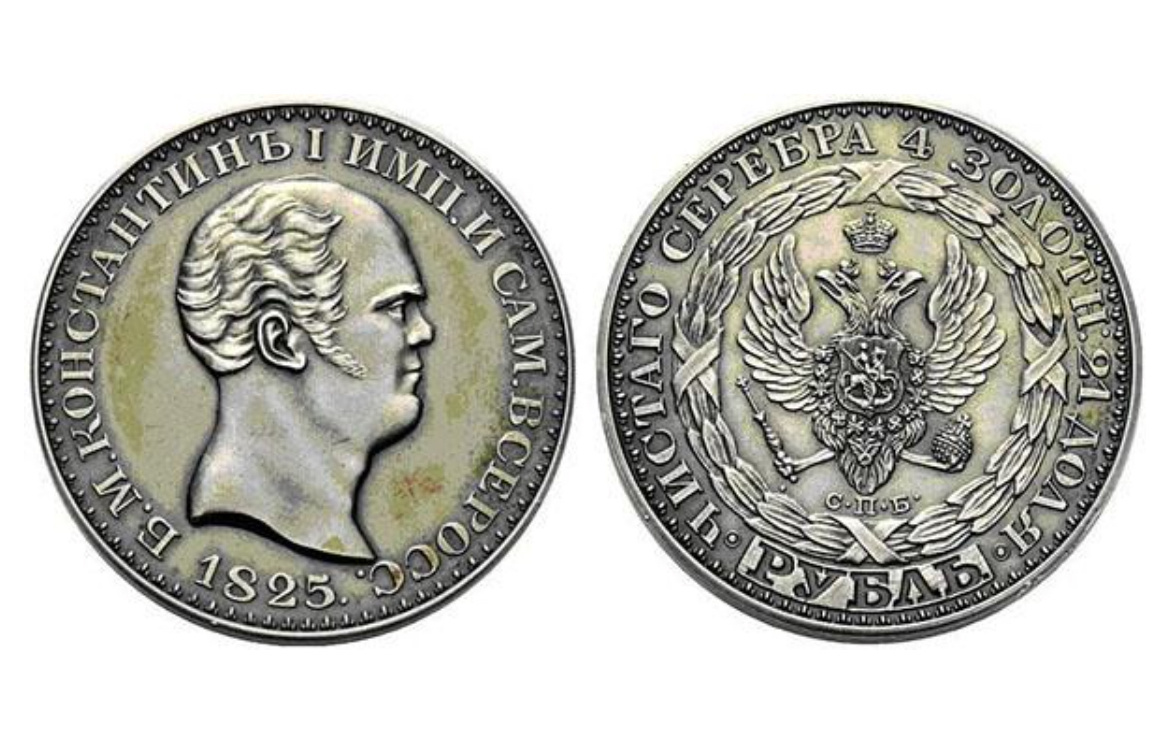 - На монете изображён не вступивший на престол император. В 1825 году в Таганроге скончался Александр I, и предполагалось, что престол перейдёт к брату Константину. Однако ещё в 1823 году вышел манифест, в котором говорилось, что Константин не может претендовать на престол, а место достаётся его брату Николаю.