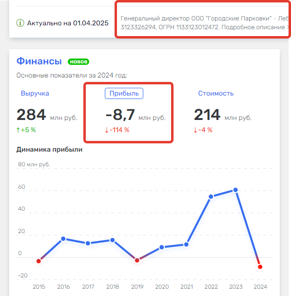 Информации по среднемесячной зарплате за прошлый год пока не опубликовано, но в 2023 году она была приличной для Воронежа – более 131 тысячи рублей. Из открытых данных, основанных на бухгалтерской отчетности организации, следует, что у нее есть риски по показателю «Финансовая устойчивость», а по «Эффективности» оценивается работа ООО «Городские Парковки» как низкая.