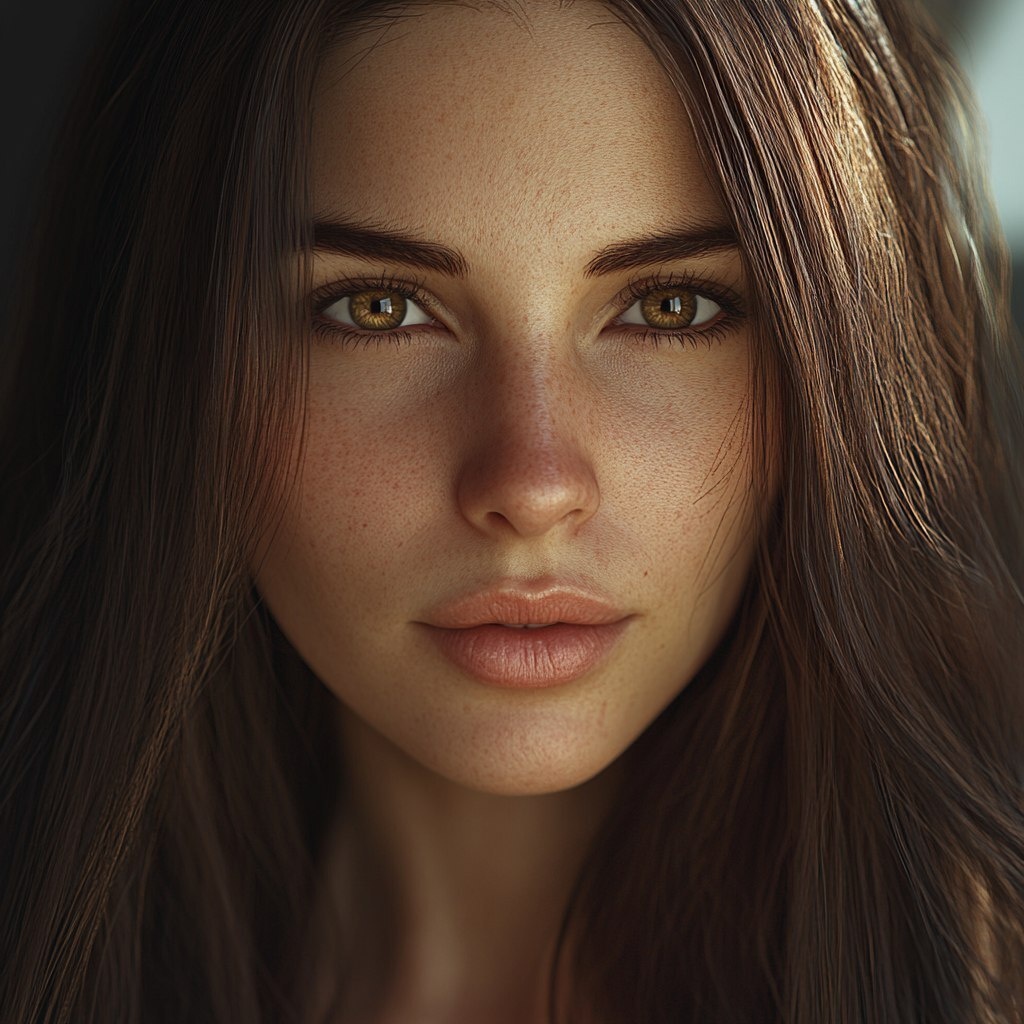 Создано на основе запроса: Stylized portrait of a woman with long brown hair, hazel eyes, ultra smooth and clean face, composition, ultra-detailed, hyper-realistic lighting, 8K, extreme long shot, full head shot, front view