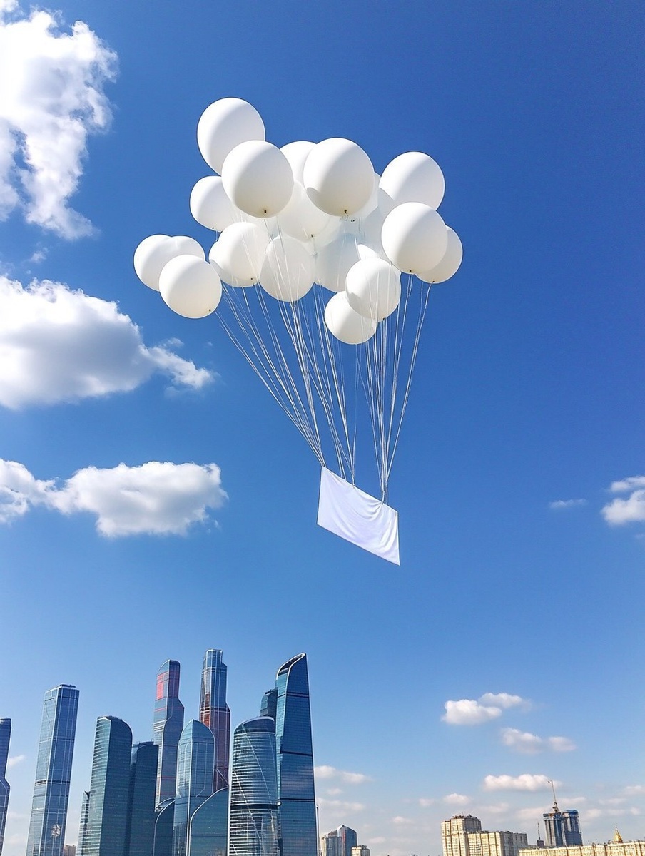 Создано на основе запроса: a symmetrical photo of a flying in the sky huge white banner attached to white balloons. In the background there is Moscow City with sky scrapers. The photo was taken on iPhone, in casual.