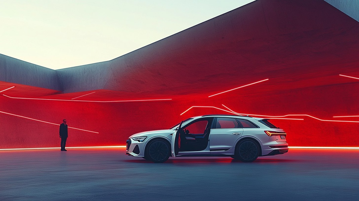 Создано на основе запроса: shot of a white audi a 6 e-tron avant during night in front of a minimalistic abstract shaped architecture