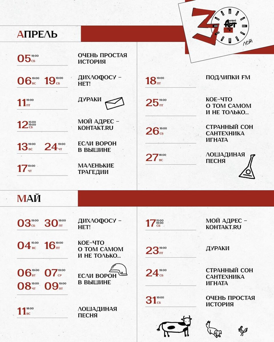 Уважаемые зрители и друзья Нового Арт Театра🎭 Публикуем для вас афишу на апрель и май💫 Бронируйте билеты на сайте театра — art-teatr.ru А также, по телефону: +7 (916) 460-37-62 и +7 (495) 510-56-23 До встречи в НАТе❤️🔥