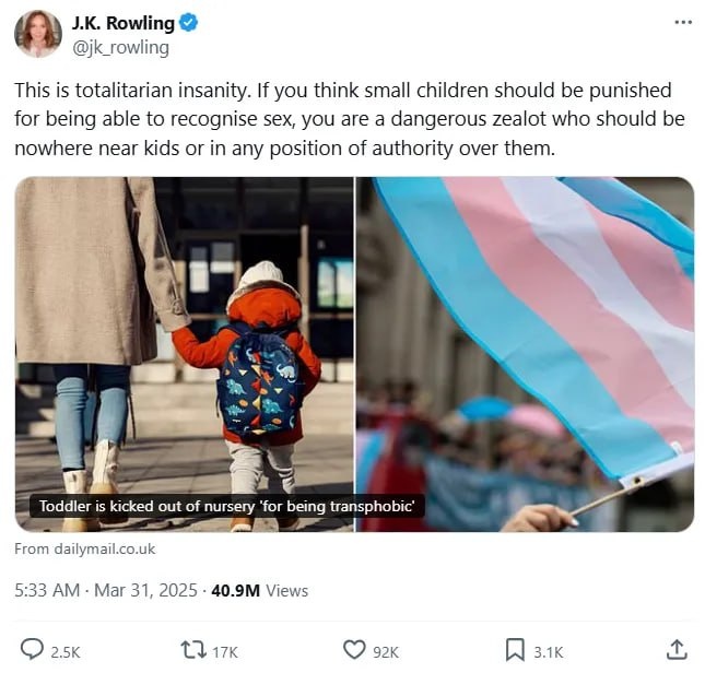 В Великобритании ребенка выгнали из детского сада «за трансфобию» Инцидент произошел еще в 2022/23 учебном году, но СМИ стало известно об этом только сейчас. Согласно статистике, в том же году 94 детсадовца и школьника также были отстранены от занятий или навсегда исключены за трансфобию или гомофобию. Свое мнение о ситуации выразила автор книг о Гарри Поттере Джоан Роулинг. Ранее писательницу обвиняли в нападках на трансгендеров* и ЛГБТ-сообщество. «Это тоталитарное безумие. Если вы считаете, что маленьких детей следует наказывать за то, что они не могут распознать пол, то вы опасный фанатик, которому не место рядом с детьми или в любой должности, дающей им власть», — написала Роулинг. * Движение ЛГБТ признано экстремистским и запрещено в России. 👍 БайБайден. Подписаться