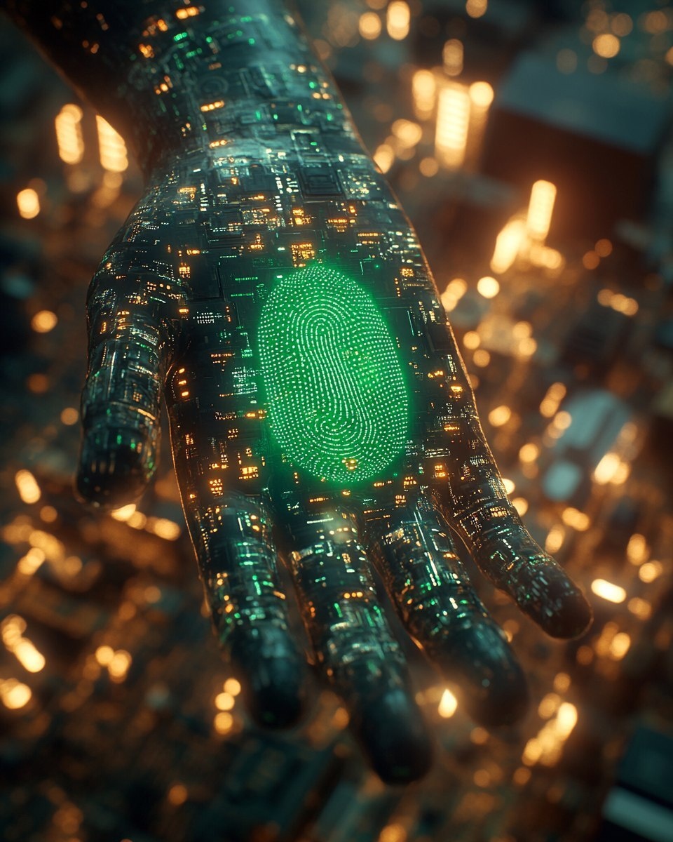 Создано на основе запроса: Cyberpunk, futuristic scene, glowing green palmprint hovering over a biometric sensor surface, no visible hand, digital scanning lines and holographic interface analyzing the print, surrounded by intricate electronic circuits, microchip textures, and scrolling data, dominant colors: black, white, green, brown, with warm brown tones in the sensor housing and crisp white light accents in the interface, moody ambient lighting, surreal high-tech textures, dramatic contrast, ultra-detailed composition with sharp focus on the floating fingerprint and digital elements