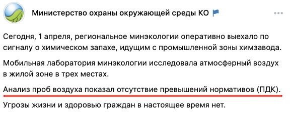Минохраны окружающей среды Кировской области утверждает, что сегодня в Чепецке «анализ проб воздуха показал отсутствие превышений нормативов (ПДК)». Это манипуляция фактами. Ведомство умалчивает, что анализы воздуха они брали спустя шесть часов после поступления жалоб от жителей. Но упоминание этого нюанса сделало бы бессмысленным всё заявление.