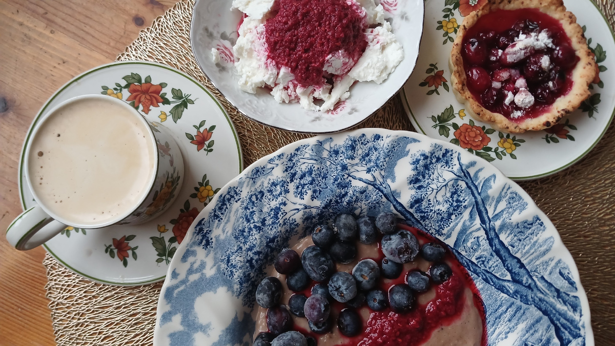 Сегодня завтрак под названием "Ягодное ассорти" 🤩 Завтракаем шоколадной овсянкой с ягодами (голубика и малина), в пластовой творог тоже протертую малину добавила, а к кофе - творожная галета с клюквой Галета - подарок от марта - апрелю Остатки творога из холодильника превратились в творожное тесто для галеты, остатки клюквы - в ее начинку. Получилось по штучке всем к кофе и чаю. Пекла хлеб, заодно и галеты испекла. С клюквой, конечно, выпечка шедевральная получается 😇 На обед сварила суп из красной чечевицы, добавила куркуму и адыгейскую соль в него. А на второе -сосиски с морковным салатом и свежим огурцом и вот такой десерт после обеда: кофе с сыром и конфетками на ужин приготовила гречку по-купечески с куриным филе и овощами. Провела опрос, предложив 2 варианта - обычный плов или гречка по-купечески. И муж, и сын попросили гречку. Добавила много овощей - капусту, помидоры, морковь, болгарский перец. Меню год назад Гречка с курицей и овощами Из запасов: всё! И у нас закончились в