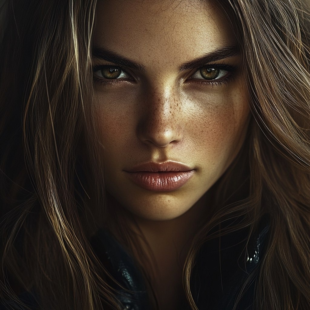 Создано на основе запроса: Stylized portrait of a woman with long brown hair, hazel eyes, composition, ultra-detailed, hyper-realistic