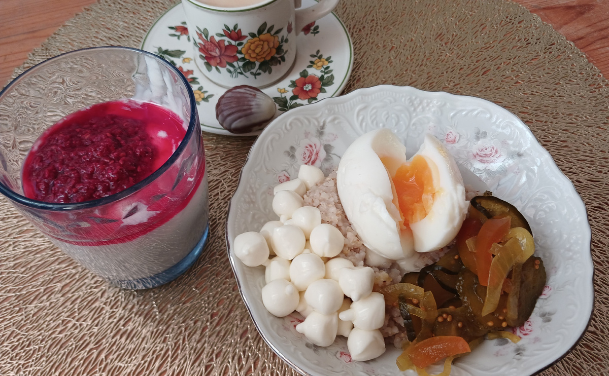 На завтрак приготовила боул с киноа. Для наполнения у меня вареное яйцо, мини-моцарелла и огурчики как в Маке. Еще был домашний йогурт с малиной и кофе с конфетой Обед такой же, как вчера - чечевичный суп и бутеброды с рыбной намазкой (консервы, маринованные огурцы, укроп и ложка майонеза) На десерт чашка кофе и к ней сушка, манго и конфета На ужин запекла в духовке язык под сыром, на гарнир - кускус с прованскими травами и маринованные огурцы Поскольку для запекания языка включала духовку, попутно испекла еще кефирный бисквит с черникой Меню год назад Из запасов: кускус, маринованные огурцы, консервы рыбные, укроп, манго сушеное, конфеты, огурчики как в Маке, киноа, малиновое пюре