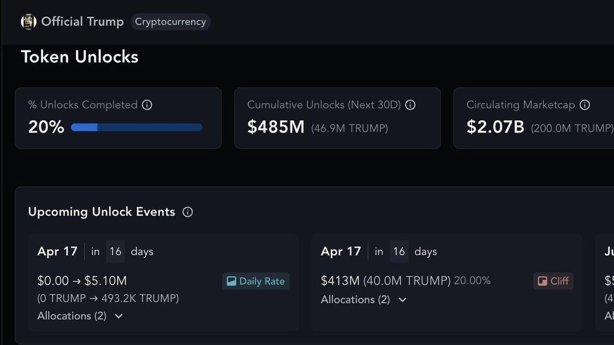 Первое крупное разблокирование токенов для мем-криптовалюты $TRUMP запланировано на 18 апреля