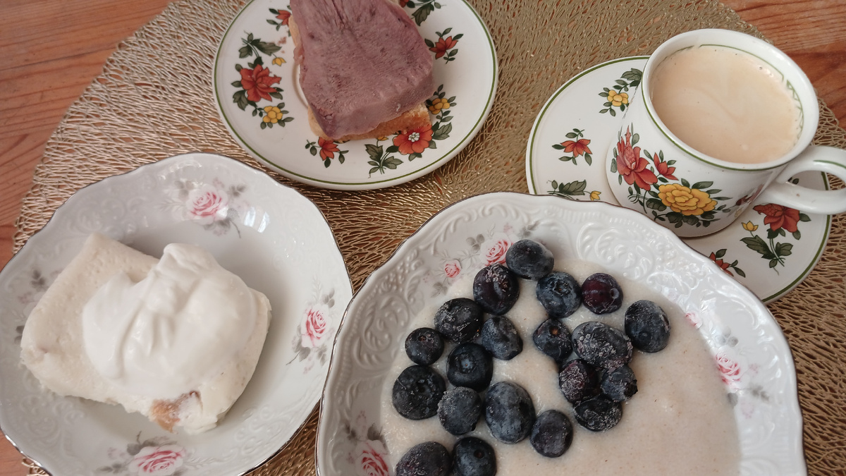 На завтрак манка из полбы с голубикой, творожный сырок с изюмом, чашка кофе и бутерброд с языком Сырок "Хуторок" ооочень сладкий, ОЧЕНЬ! Но по составу вполне себе неплох - творог, сахар, изюм и сливочное масло. Думаю, хорош будет в выпечке или в блинчиках в качестве начинки. А еще у меня есть рецепты выпечки на творожных сырках в старых семейных кулинарных тетрадях, нужно исполнить. На обед доели чечевичный суп, к супу сделала бутерброды с языком и йогурт с персиковым джемом и потом еще кофе попила с манго сушеным и конфеткой На ужин у нас сегодня жюльен из языка с грибами, гречка и салат из капусты с помидорами и чесноком, заправлен сметаной Меню год назад Жюльен на сковороде