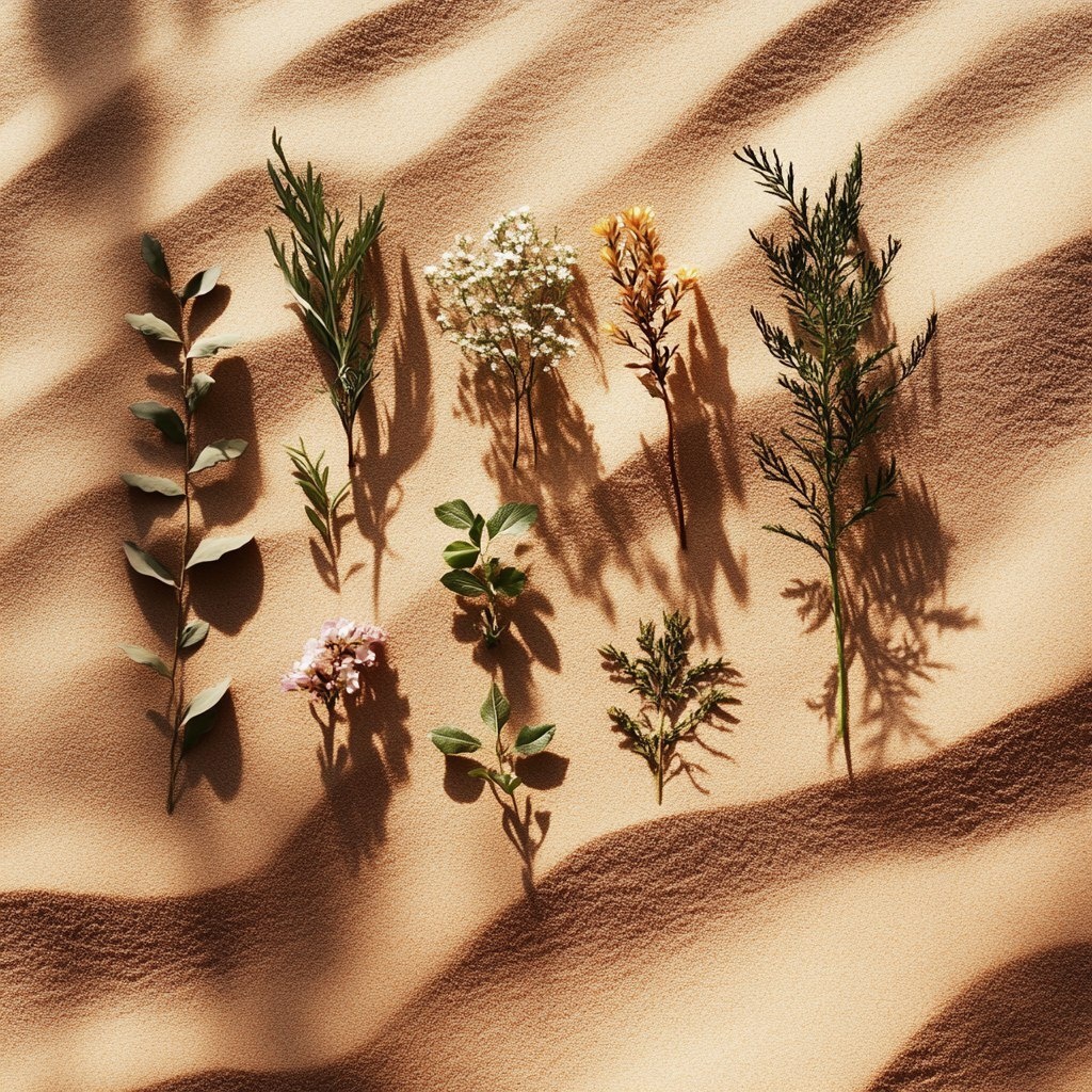 Создано на основе запроса: Botanicals arranged in symbols on desert sand, high contrast shadows, minimal earthy vibe