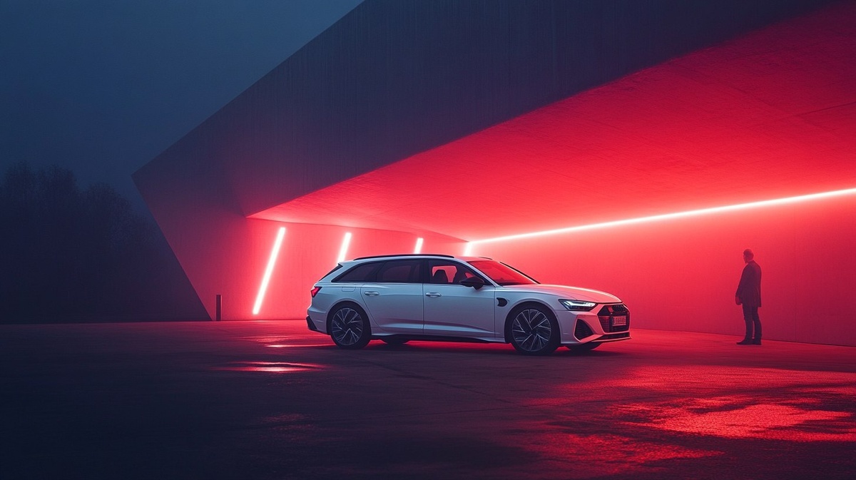 Создано на основе запроса: a shot of a white audi a 6 e-tron avant during night in front of a minimalistic abstract shaped architecture, red and white led lights on the buidling, no architecture, the audi a6 e-tron avant is parking in a void like environment with the bright LED Lights illuminating the night environment, a man is watching after the car, super high quality lots of details, hyper realistic