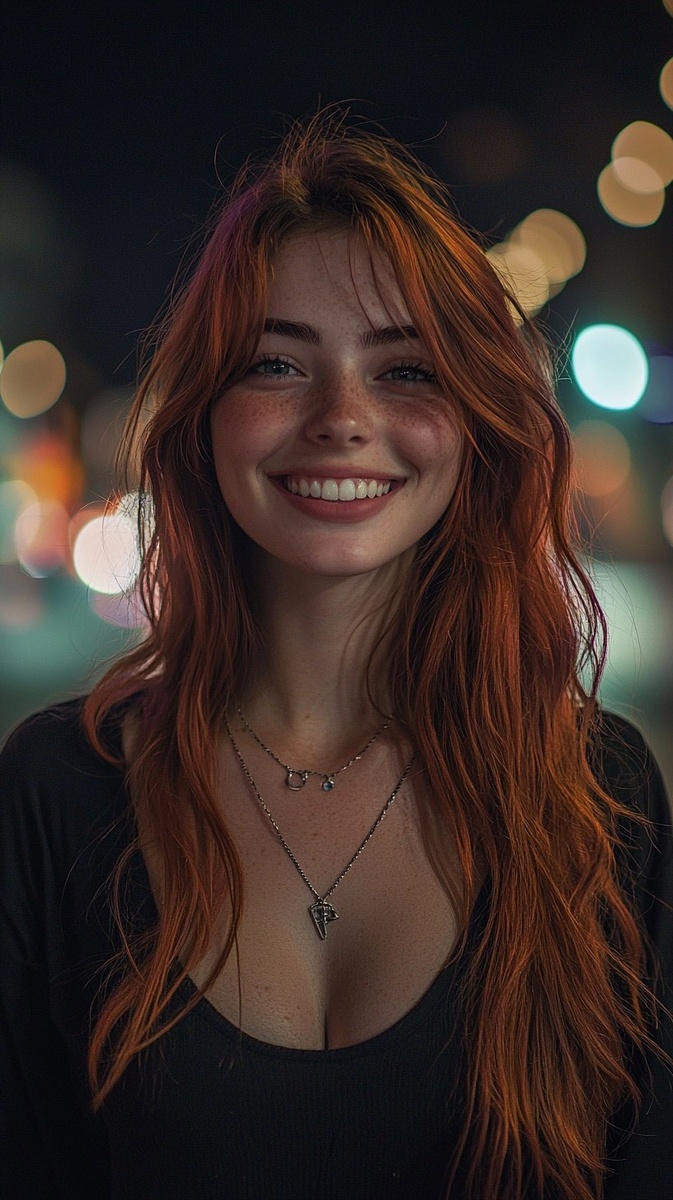 Создано на основе запроса: Full body realistic photograph of a cute 25 years old redhead smiling mischievously at the camera, natural beauty, no makeup, Full body, Macro Shot, Moving Subject, Summer, Night, Volumetric light, HDR, Leica 1.8mm Lens