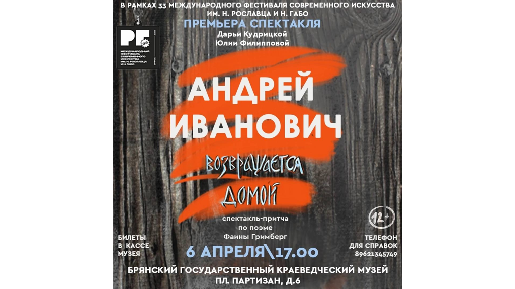 В воскресенье, 6 апреля, в 17:00 в Брянском государственном краеведческом музее состоится премьера спектакля «Андрей Иванович возвращается домой». Его представят в рамках проведения Международного фестиваля современного искусства имени Н.Рославца и Н.Габо.