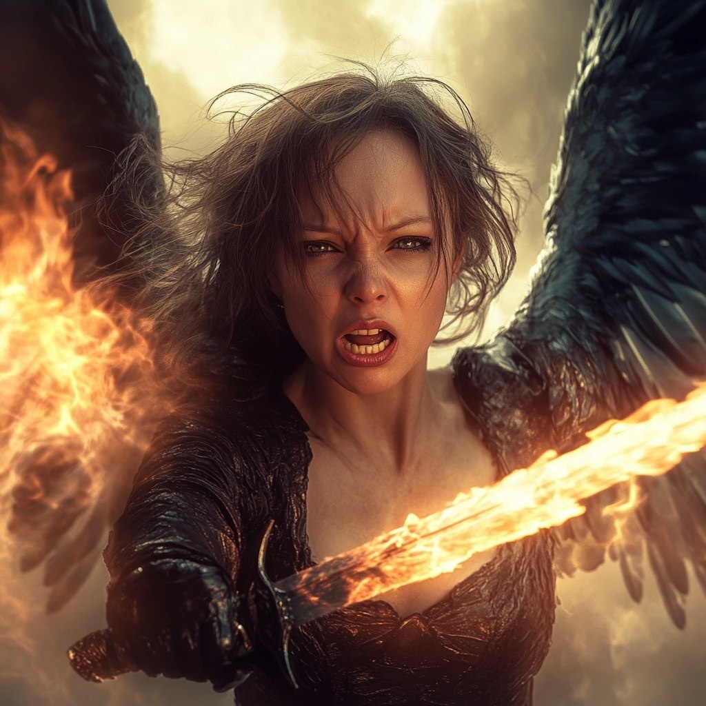 Создано на основе запроса: furious angel with flaming sword, angry female warrior, beautiful angel of wrath, warcry, screaming in anger